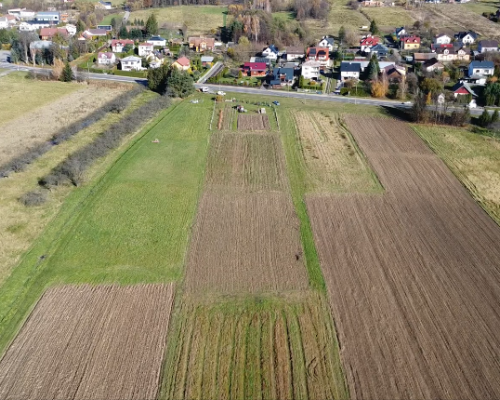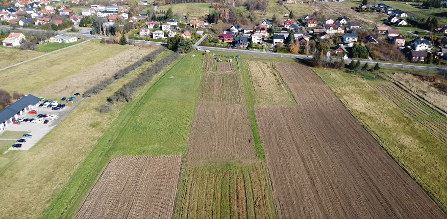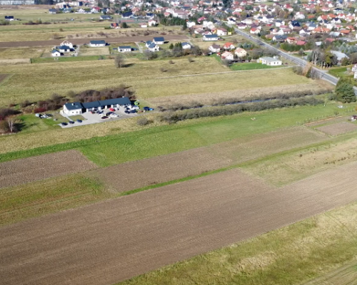 Działka zlokalizowana przy drodze krajowej nr 28 w otoczeniu pól uprawnych i rozproszonej zabudowy domów jednorodzinnych.