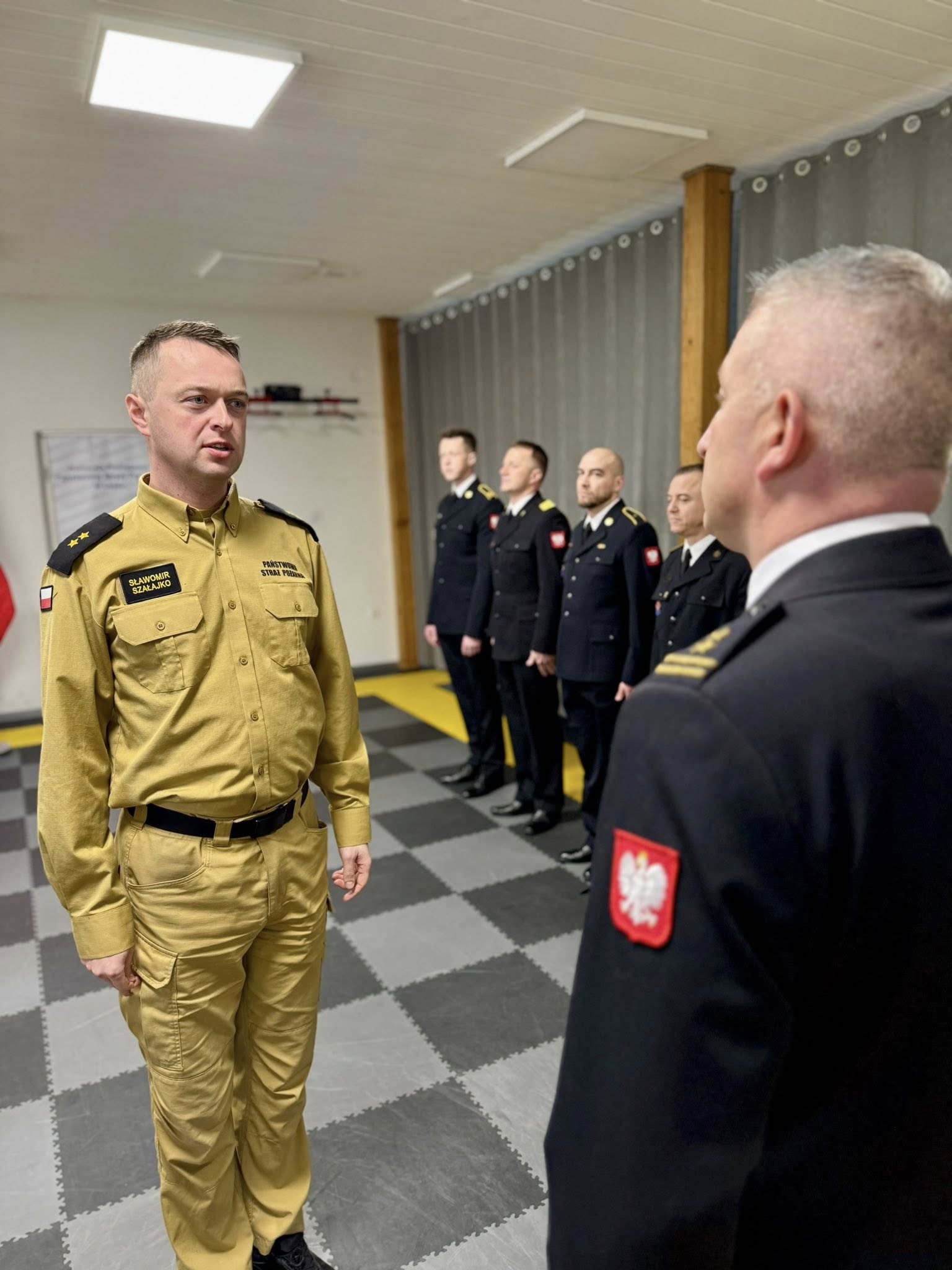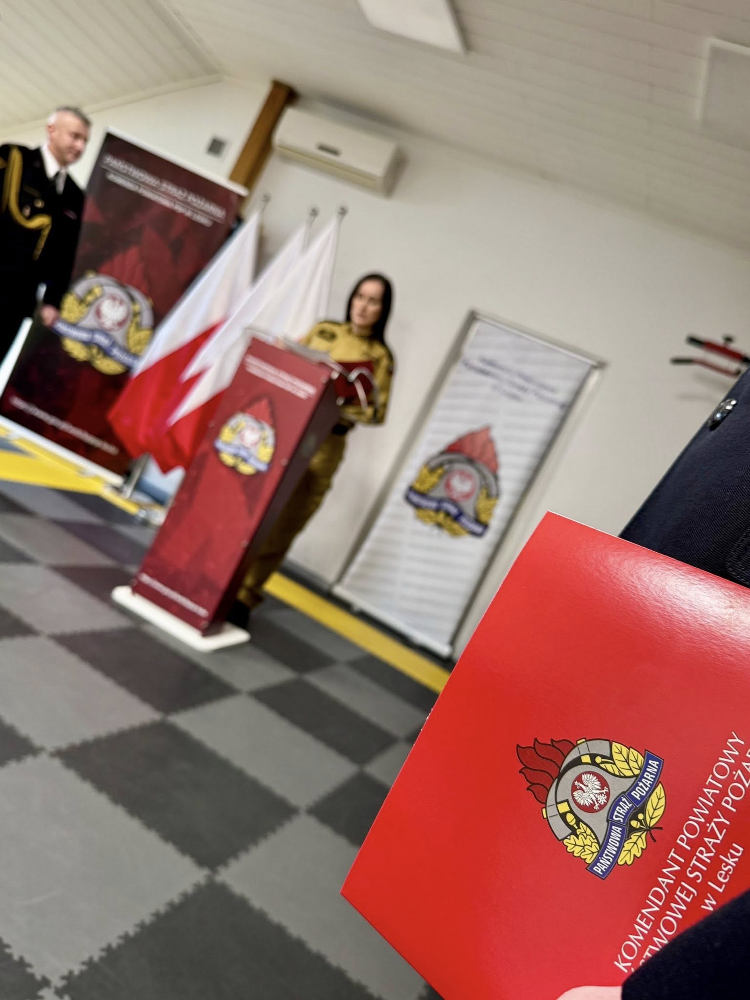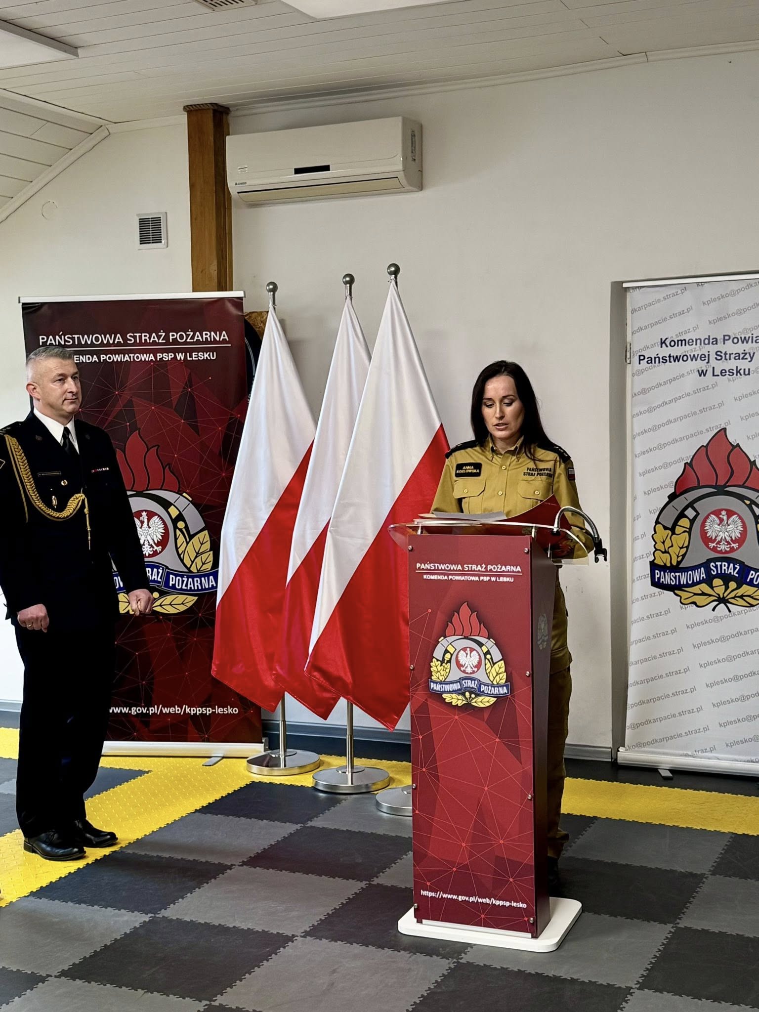 Komendant Powiatowy PSP w Lesku, bryg. Robert Wojciechowski, powitał wszystkich zebranych i podziękował strażakom za codzienny trud, profesjonalizm oraz zaangażowanie w nowe zadania, jakie stawia przed nimi Państwowa Straż Pożarna, w tym działania związane z ochroną ludności i obroną cywilną.